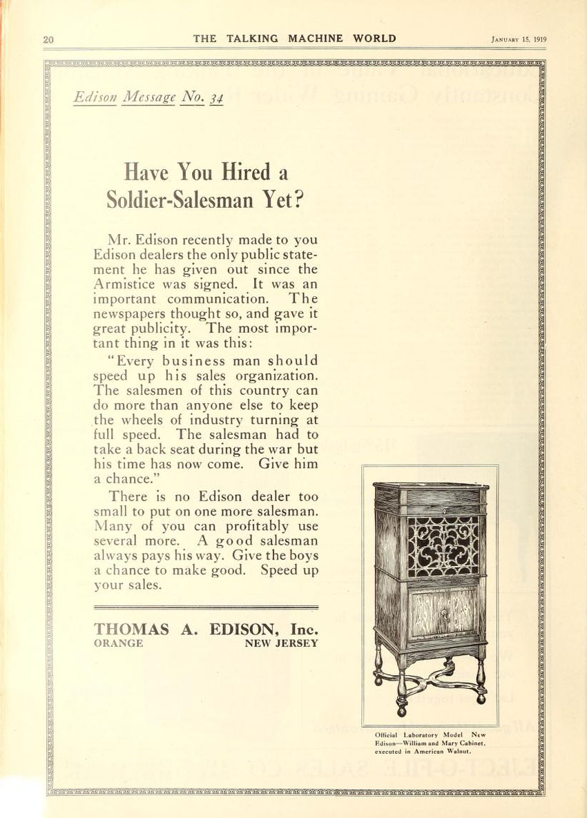 Edison advertisement, The Talking Machine World, January 1919