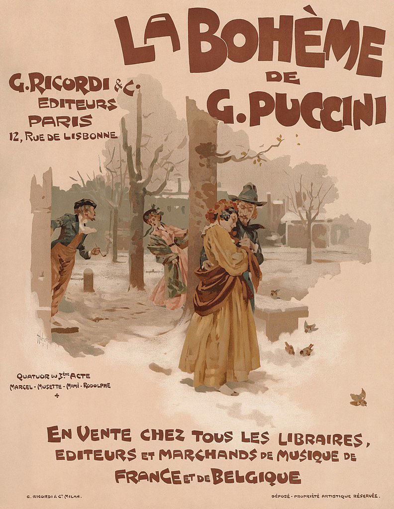 1895 advertisement for the music score of Giacomo Puccini's La bohème, showing the quartette in the third act between Marcello, Musetta, Mimi, and Roldolpho - Wikipedia (20)