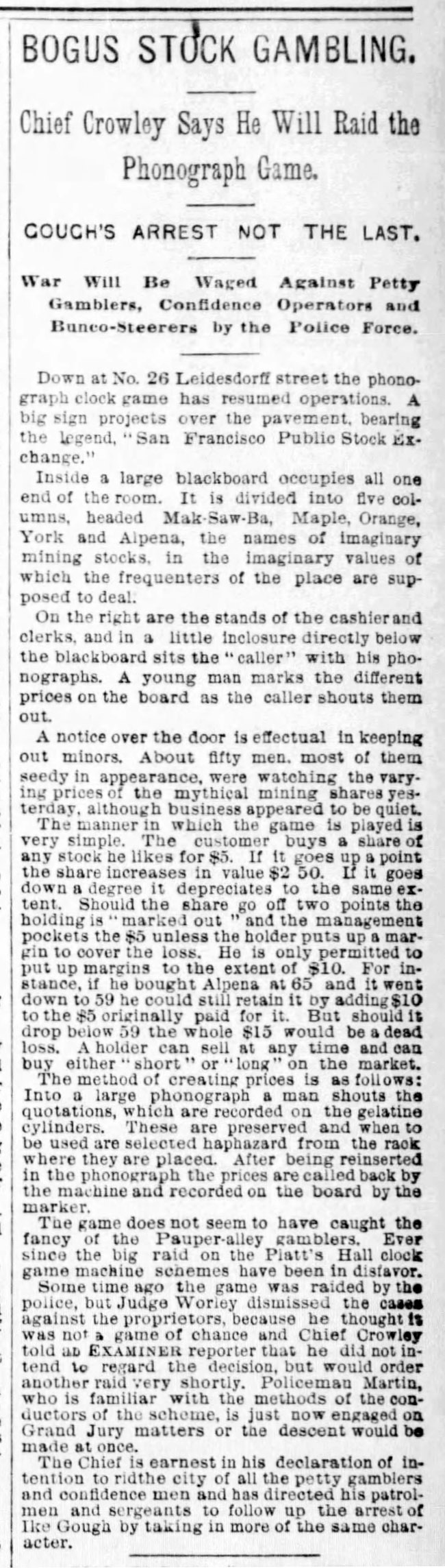 "BOGUS STOCK GAMBLING." Chief Crowley Says He Will Raid the Phonograph Game.