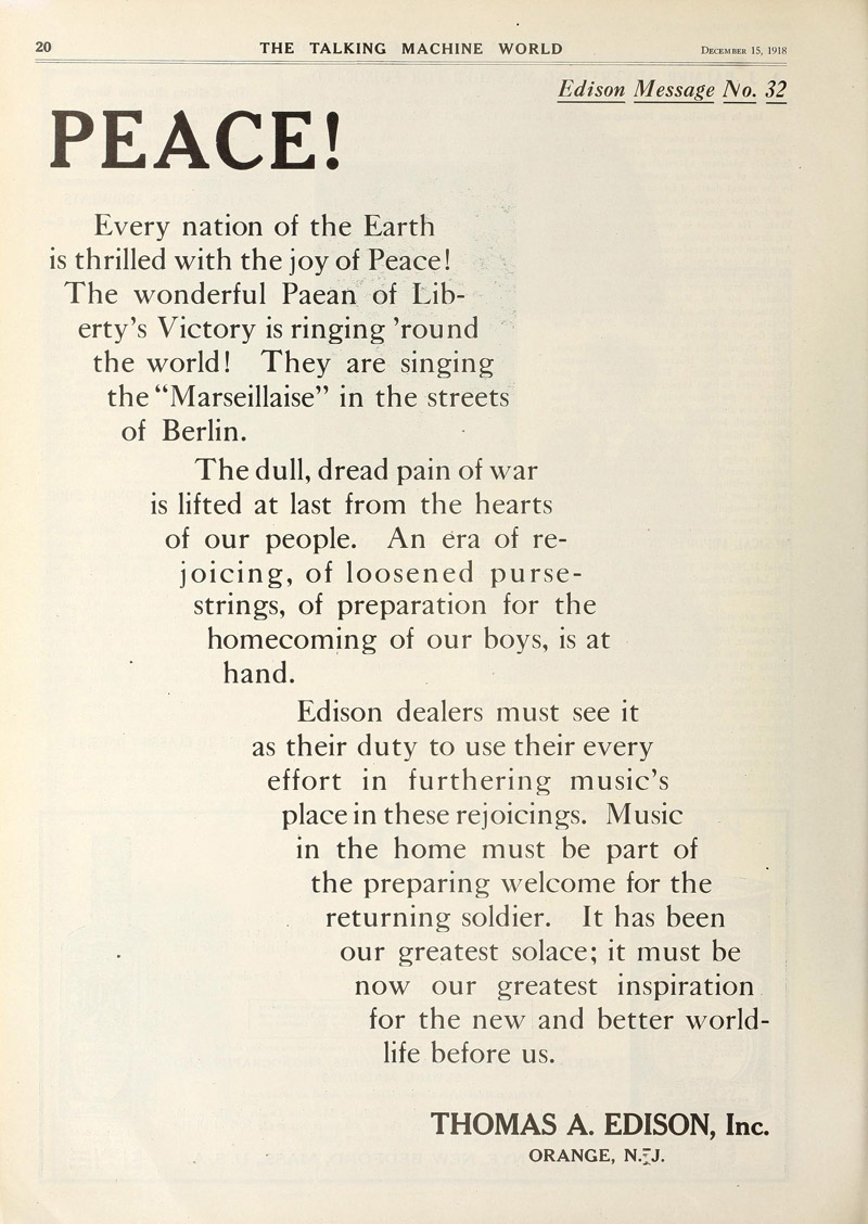 Edison Message No. 32, The Talking Machine World, December 15, 1918