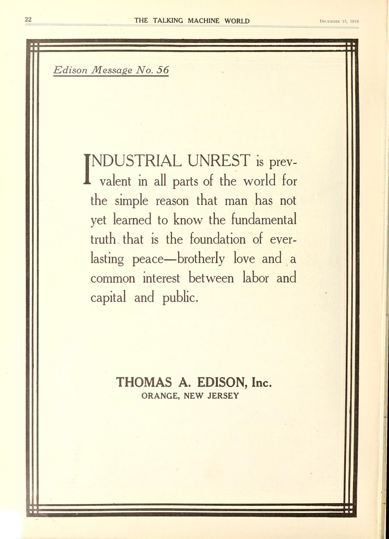 By the end of 1919 Edison was addressing a post-war problem with his December Message No. 56 that was simple and to the point: "Industrial unrest is prevalent in all parts of the world for the simple reason that man has not yet learned to know the fundamental truth that is the foundation of ever-lasting peace -- brotherly love and a common interest between labor and capital and public."
