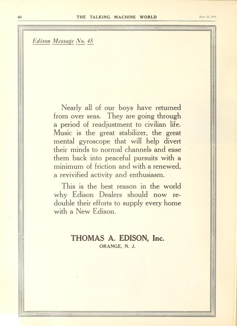 Edison Message No. 45, The Talking Machine World, July 15, 1919