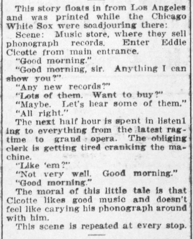 But it wasn't that he didn't like the music. Instead, the article points out that on the contrary Cicotte liked good music but didn't like carrying his phonograph around with him when he traveled and therefore used music stores to listen to music.