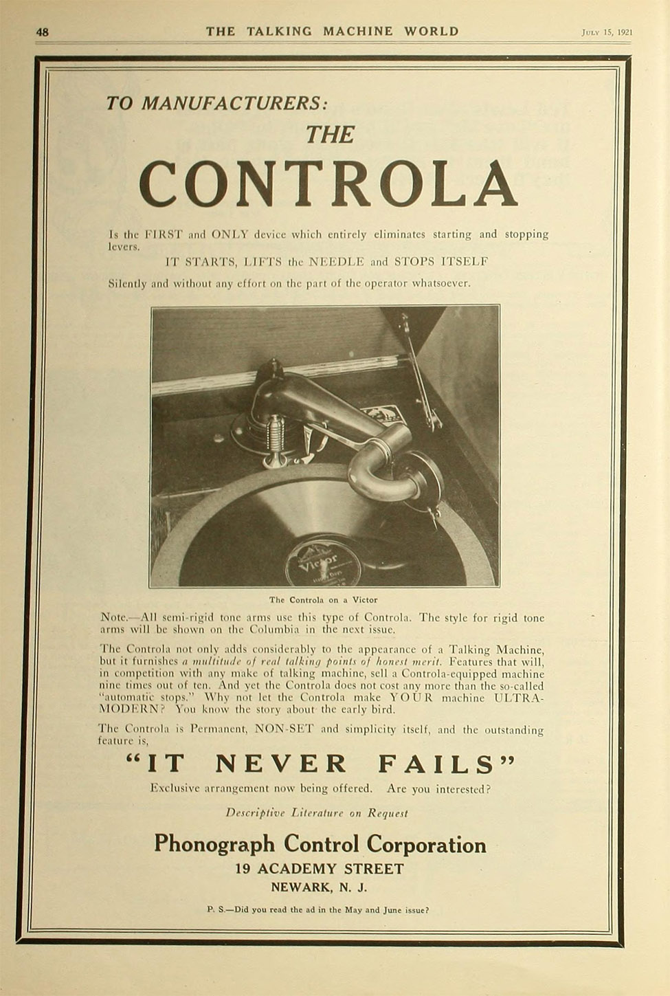 Controla - "It Never Fails, " The Talking Machine World, July 15, 1921