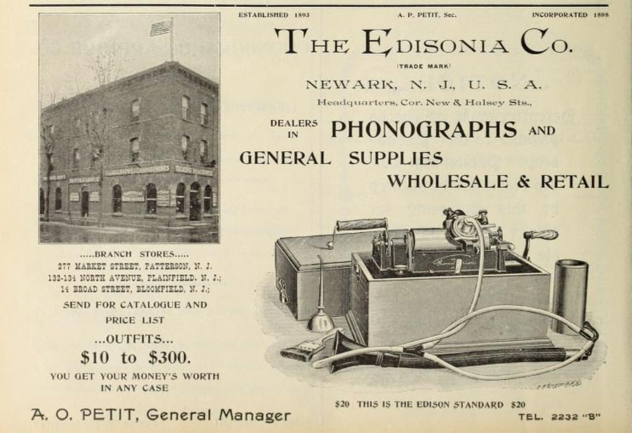 FACTOLA, November 1898 - The Edisonia Co., of Newark, N. J. included their telephone number in their November 1898 The Phonoscope ad: TEL. 2232 "B". This was the first advertisement in The Phonoscope to have a telephone number listed.