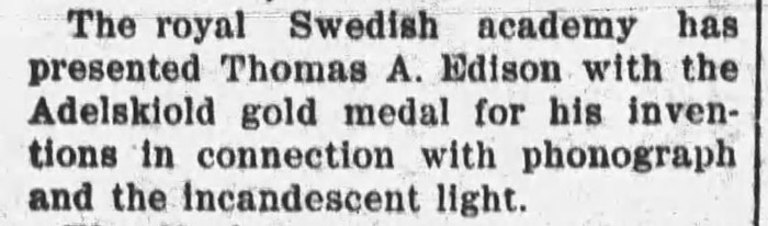 FACTOLA, April 1909 - The royal Swedish academy presented Thomas A. Edison with the Adelskiold gold medal for his inventions in connection with phonograph and the incandescent light.