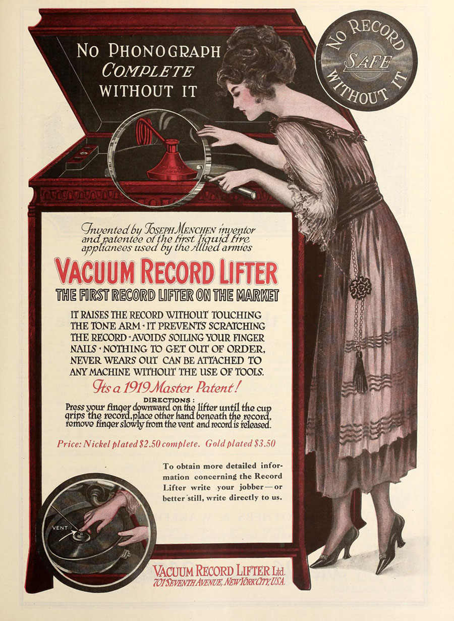 FACTOLA, April 1920 - The first record lifter on the market - The Vacuum Record Lifter "raises the record without touching the tone arm..."