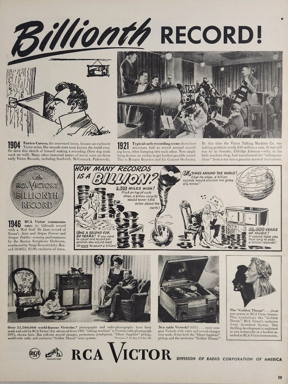 FACTOLA, 1946- RCA Victor Commemorates its Billionith Record with a Red Seal Deluxe record of Sousa's Stars and Stripes Forever and Semper Fidelis, Record 18-0053, $2.00.