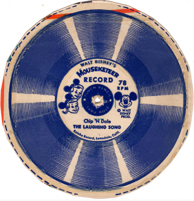 FACTOLA, 1956 - Phonograph records were put on cereal boxes as a premium to cut-out and play. According to mrbreakfast.com and Discogs the first records were on General Mills' Wheaties cereal boxes in 1956, 78 RPM cut-outs for Walt Disney's Mouseketeer Records of Chip 'N Dale performing "Ten Little Indians" and "The Laughing Song."