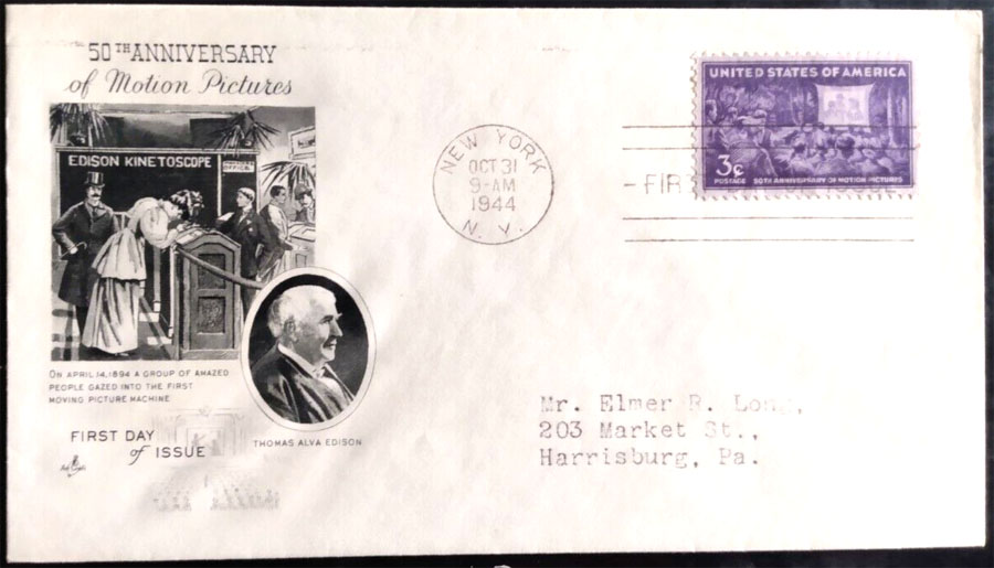 First Day of Issue for stamp celebrfating 50th Anniversary of Motion Pictures on April 14, 1894.