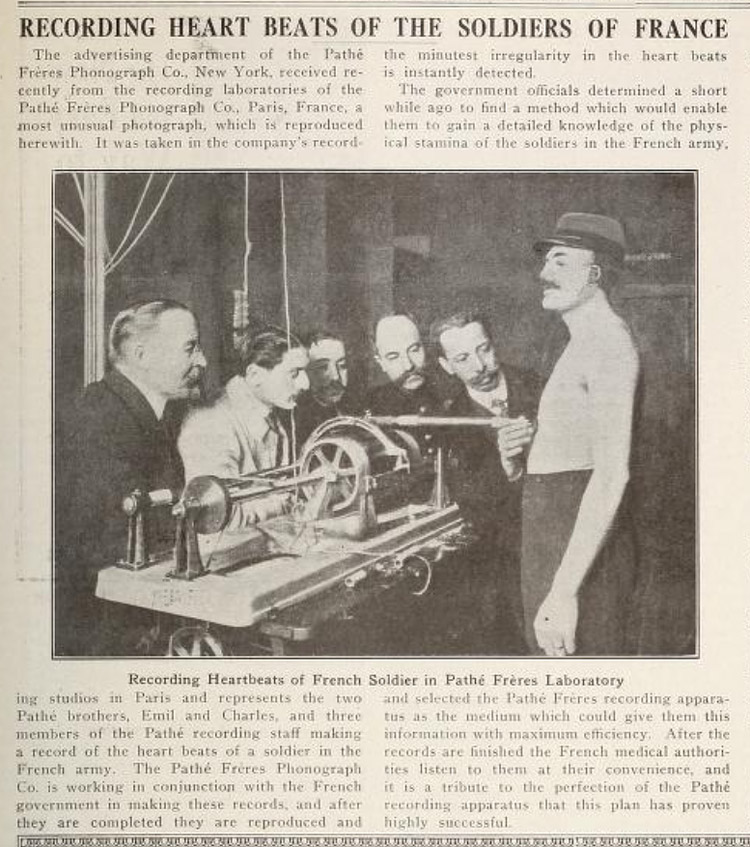 An recording appartus during World War I made a record of the heart beats of a soldier in the French army. The Pathe Phonograph Co. and the French government hoped recordings would provide detailed information of the physical stamina of the soldiers in the French army. "The minutest irregularity in the heart beats is instantly detected."