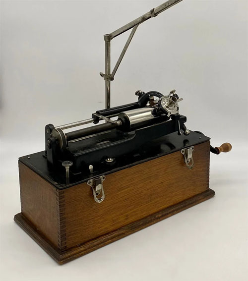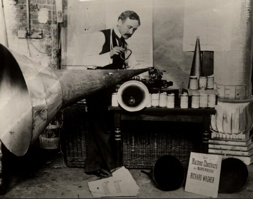 Lionel Mapleson with Edison Home Phonograph and extra large horn, probably at the Metropolitan Opera House. (1901-1903) (New York Public Library Digital Collections, Rodgers and Hammerstein Archives of Recorded Sound).