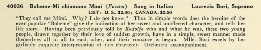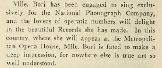 In the September 1910 Edison Phonograph Monthly in an article titled New Grand Opera Talent one of the featured artists discussed was Mlle. Bori who "has been engaged to sing exclusively for the National Phonograph Company."