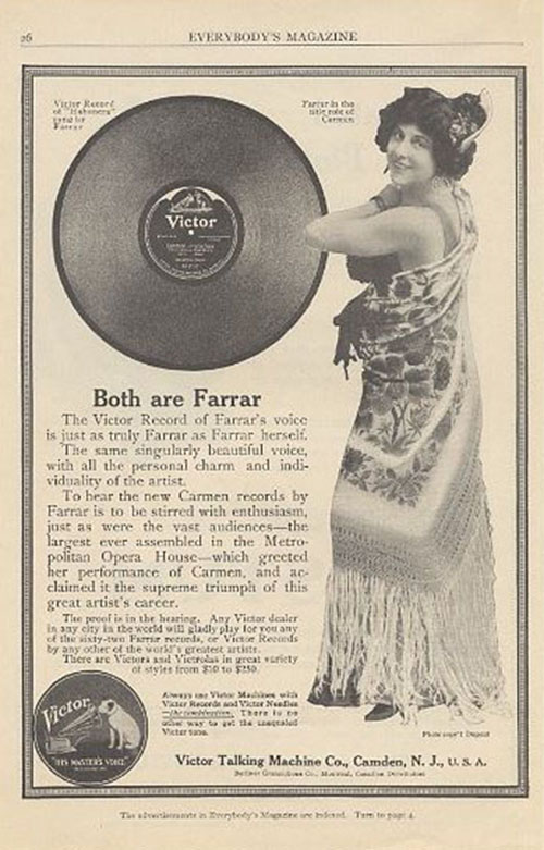 The promotion of opera by the phonograph industry also had direct and subtext ad campaigns suggesting recorded sound was the equivalent of living artists. Victor's 1915 Munsey's ad summarized it clearly: "The Victor Record of Farrar's voice is just as truly Farrar as Farrar herself."