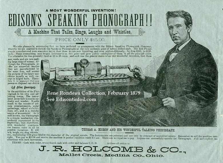 Handbill distributed February of 1879 offering the first (Bergmann) Parlor Model but showing the Brady phonograph in the ad. (Courtesy Rondeau, René, "Tinfoil Phonographs" 2001, p. 61 and Edisontinfoil.com).