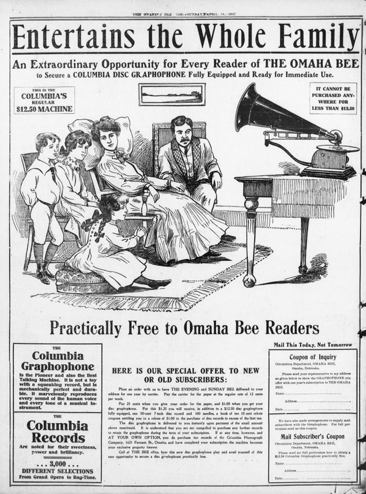 Get a Columbia Disc Graphophone "practically free" if you subscribe to Omaha Bee for one year and pay $1.25 to receive the $12.50 disc graphophone fully equipped with one 50-cent disc record and 100 needles. Purchase of additional ten records is optional but if you don't then after one year the graphophone is no longer your property. Omaha Bee Newspaper, April 16, 1905