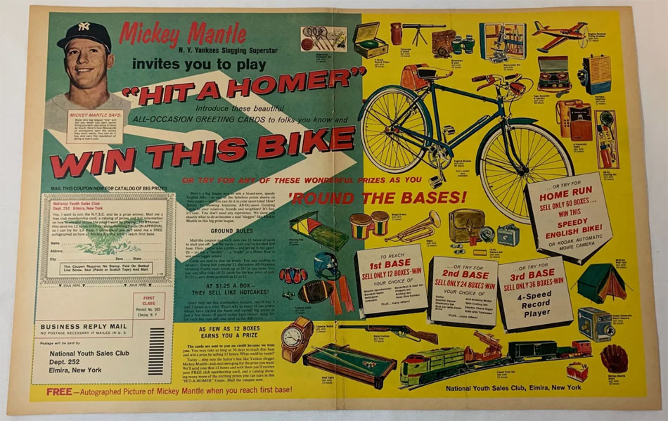 Mickey Mantle's invitation to play "Hit a Homer" was presented as an opportunity for kids to win prizes by selling greeting cards, one of the prizes being a 4-speed record player.