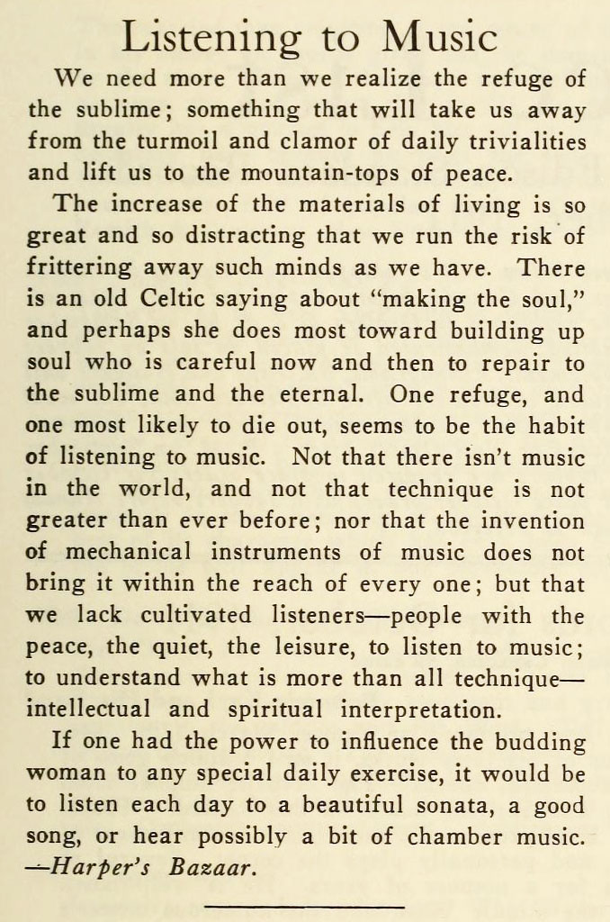 and lift us to the mountain-tops of peace." Listening to Music"
