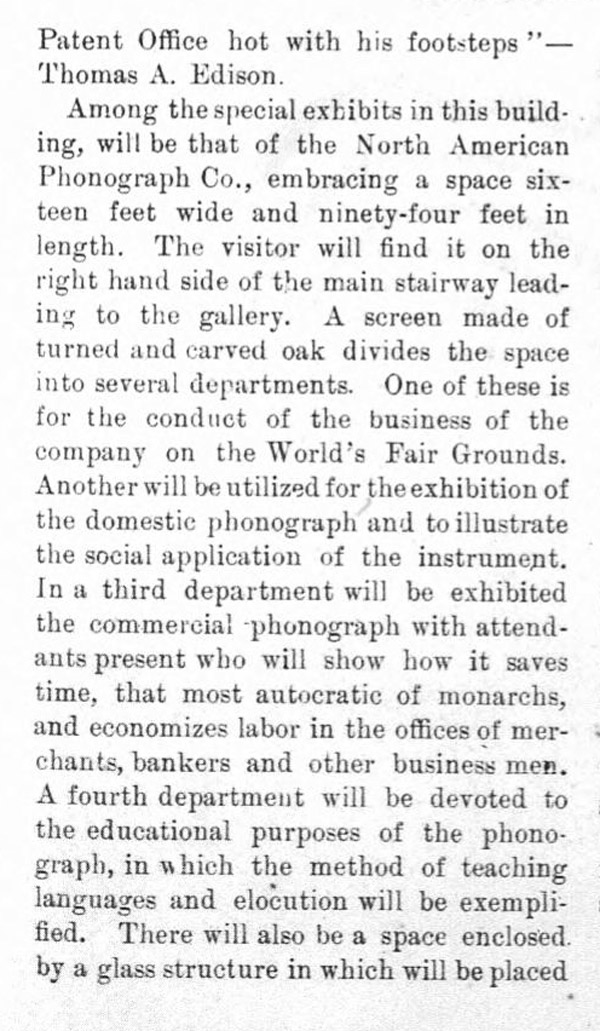 Description of the Electrical Building and the North American Phonograph Company Exhibits. The Phonogram, March and April 1893 pp. 354-356.