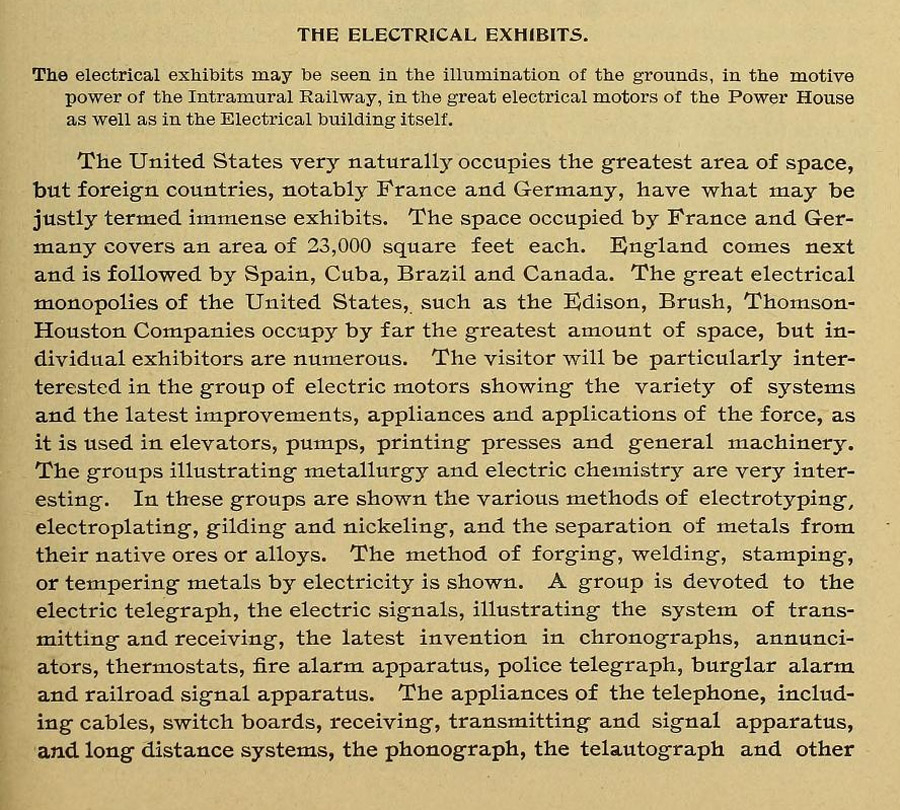 Edison's quadruplex mechanism was on display in the Electricity Buildings exhibit of telegraph and telephone service.