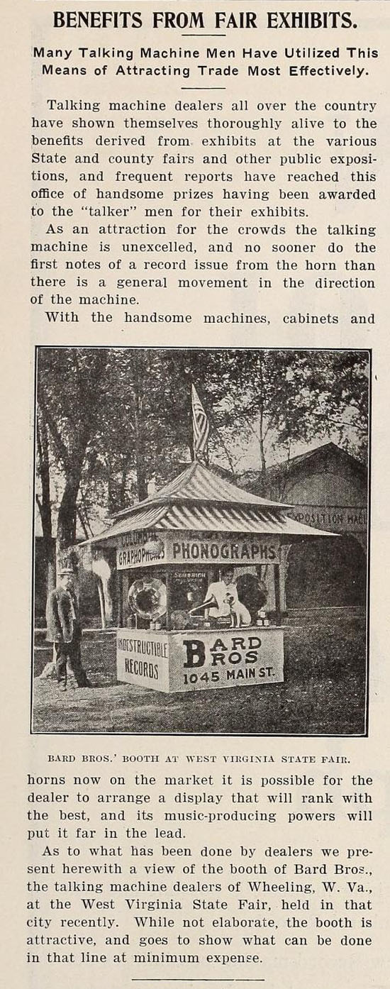 "As an attraction for the crowds the talking machine is unexcelled" and while the Bard Bros. exhibit at the recent West Virginia State Fair was "not elaborate, the booth is attractive, and goes to show what can be done in that line at minimum expense."