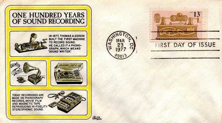 Stamps around the world are issued for many different reasons and many different themes. This gallery primarily displays stamps and First Day of Issue Covers (FDC) connected with Recorded Sound and the Phonograph. Most of the following FDCs are celebrating the 100th anniversary of the phonograph with its USA stamp "Commemorating Sound Recording" issued on March 23, 1977. Other countries issued Centennial of Sound Recording stamps and FDCs on other dates.
