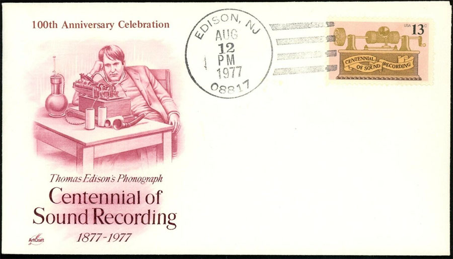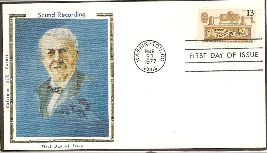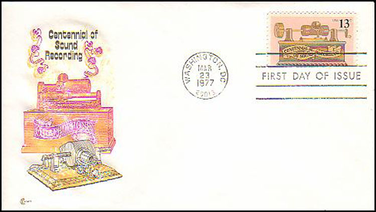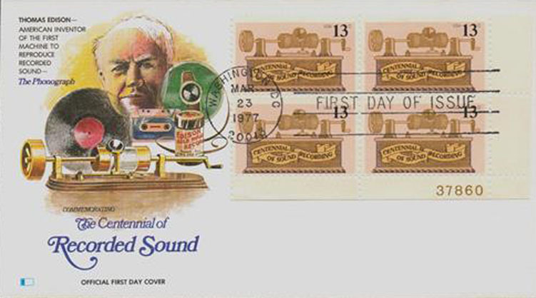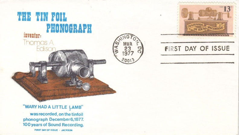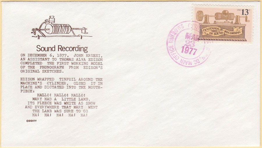 March 23, 1977 - First Day of Issue for Centennial of Sound Recording. March 23, 1977 was chosen as the official date for the stamp's issue "to coincide with an award dinner in Washington, D.C. by the Recording Industries Association of America." Nothing about the phonograph significantly happened in March 1877 and other anomalies are also part of this stamp's issuance and design such as the stamp not showing Edison's name and not illustrating his original tinfoil (Kruesi model) phonograph but instead a "tinfoil machine that wasn't made until March 1878." For additional review details related to this anniversary stamp by Allen Koenigsberg, see his article "The Anniversary Stamp," The Antique Phonograph Monthly, January 1977 (Vol. V No.1). Note that two of the First Day of Issue Covers displayed in this gallery do correctly identify December 6, 1877 as the date Edison's first words were recorded on his Phonograph and also mention "Mary had a Little Lamb..."