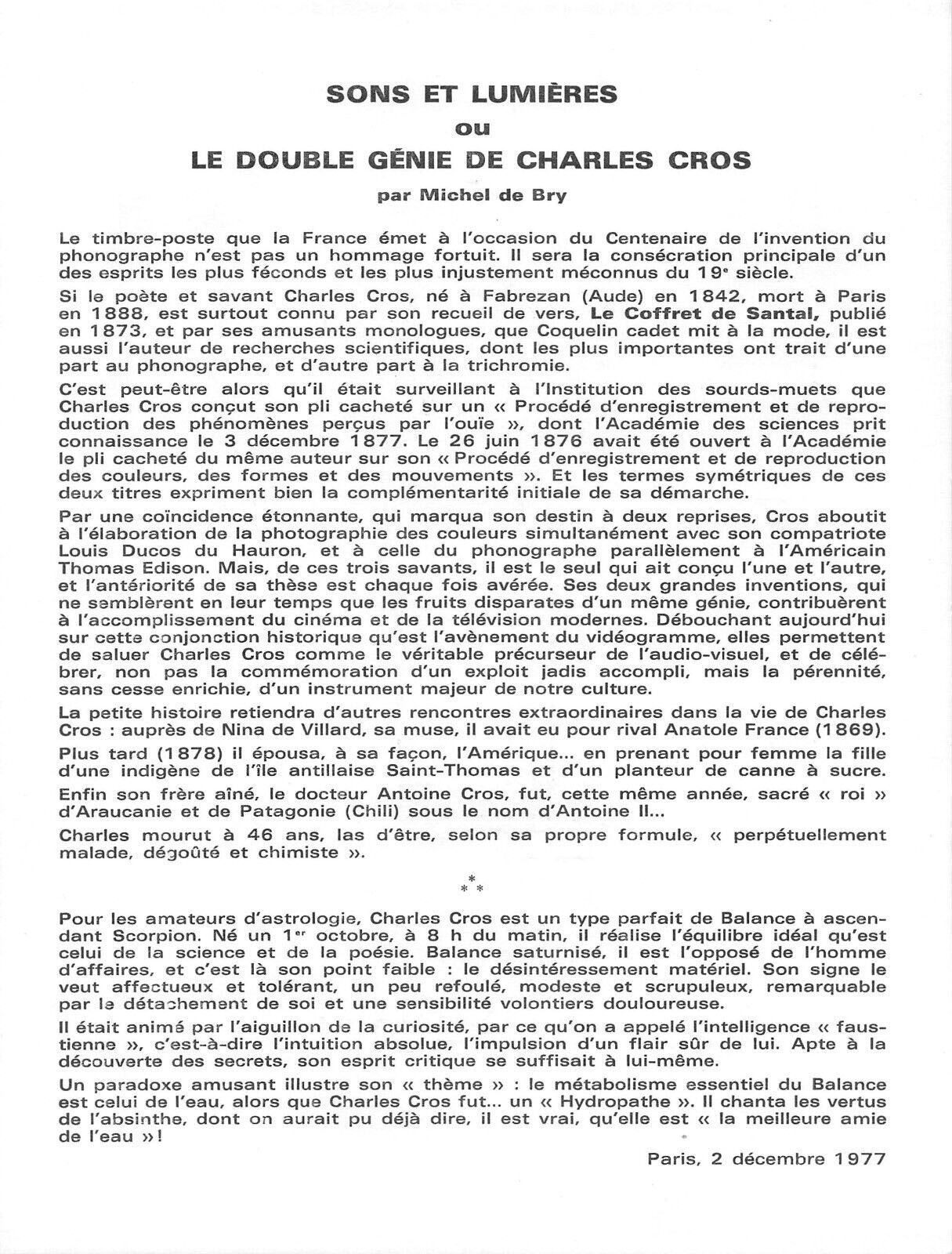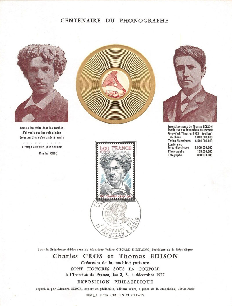 A stamp honoring Cros was issued by France on December 3, 1977. A stamp exposition was organized by Edouard Berck and the following information sheet promoted the stamp and the event which honored Charles Cros and Thomas Edison as creators of the talking machine and its 100th anniversary.