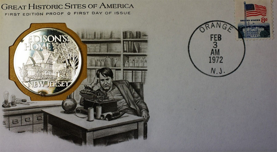 Great Historic Sites of America First Edison Proof and First Day of Issue, February 3, 1972 with Edison illustrated and seated by his Class M Phonograph.