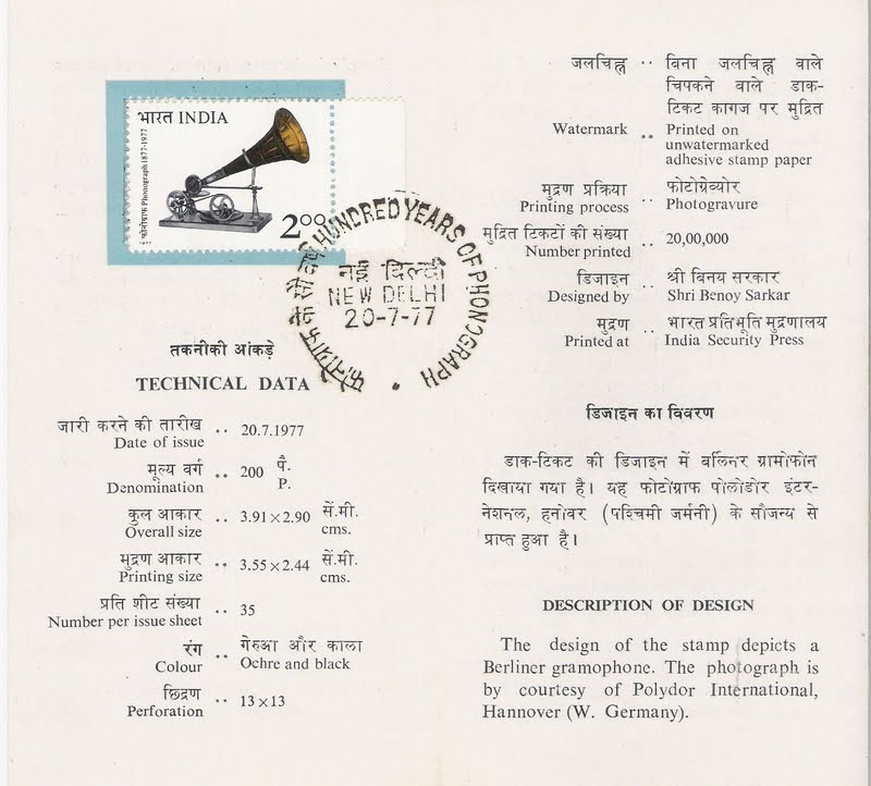 July 20, 1977 - First Day of Issue for 100 Years of Phonograph - India Postal Service (see below for postal service technical data sheet related to this stamp).
