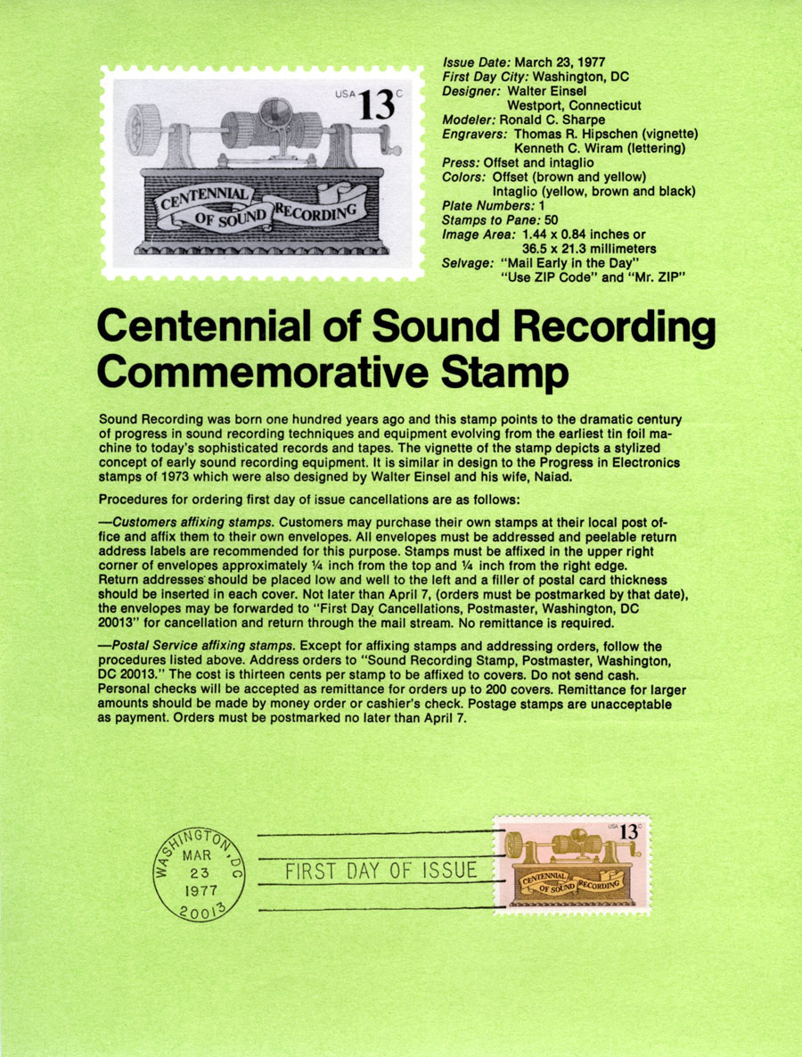 Information sheet issued by the United States Post Office regarding the 1977 Centennial of Sound Recording Commemorative Stamp. (PM-1119).