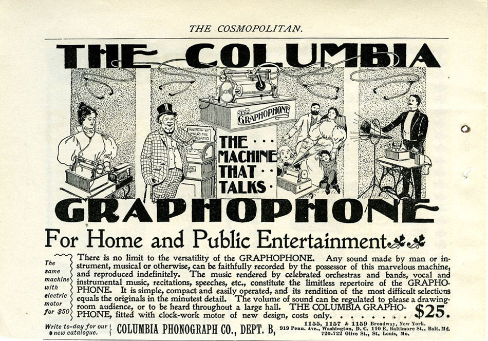 "no limit to the versatility of the GRAPHOPHONE" - the four competing uses for the phonograph in the 1890's: Business, Coin-in-the-slot, Home Entertainment and Concert/Exhibitions. The Cosmopolitan, 1897