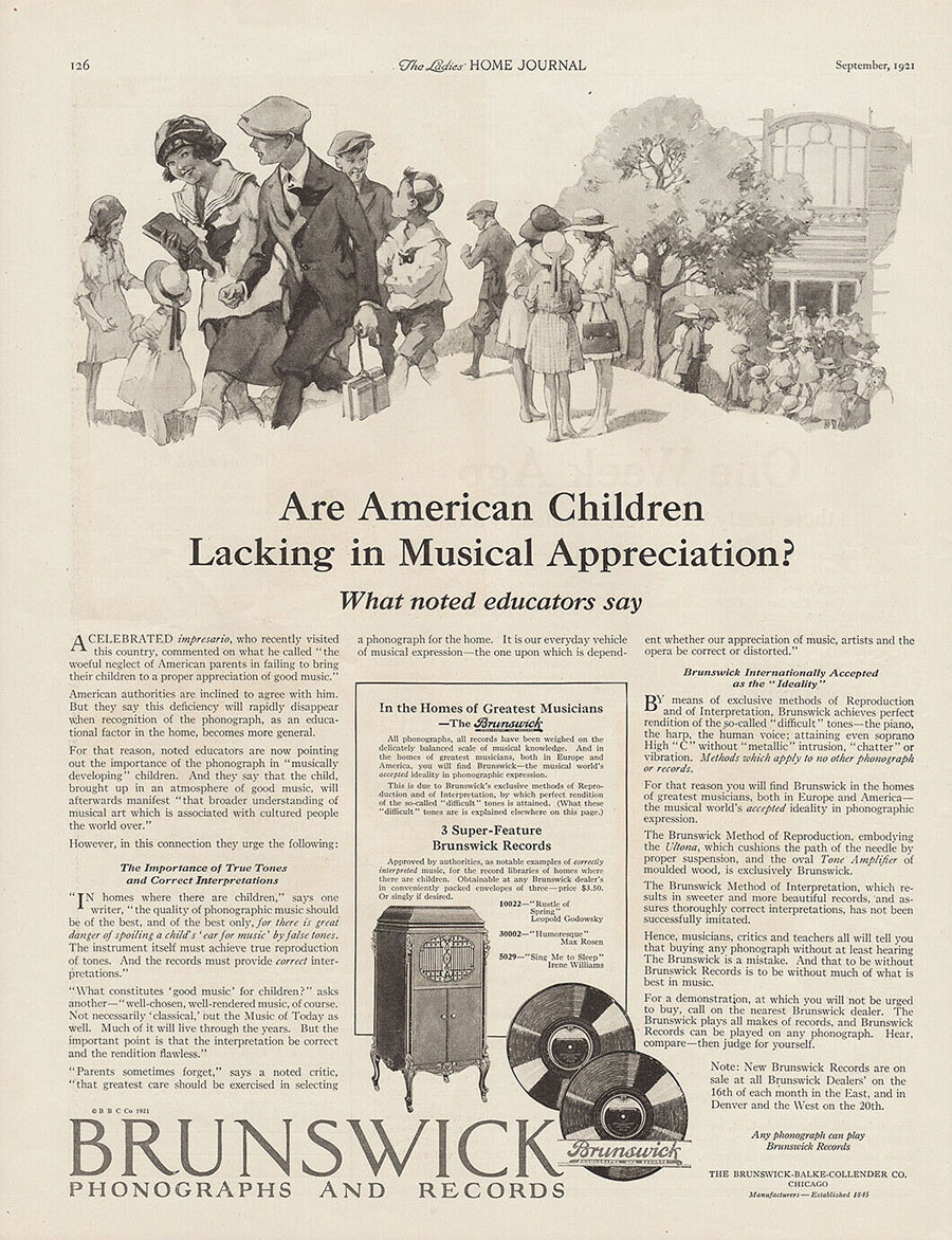 "Noted educators are now pointing out the importance of the phonograph in "musically developing" children."