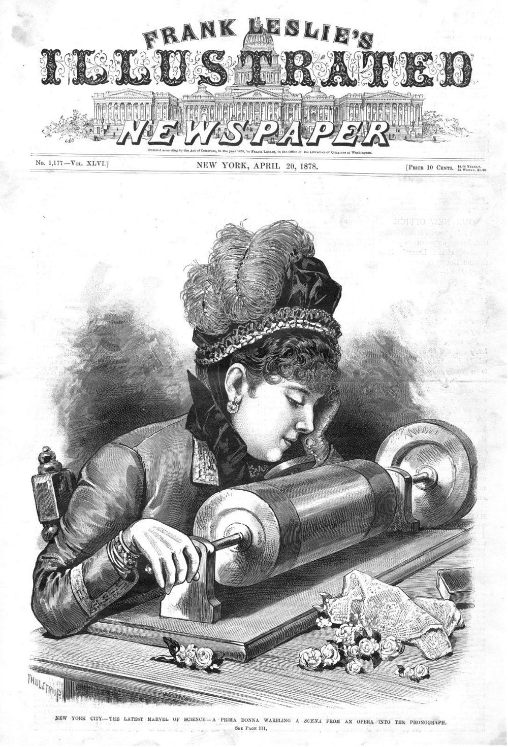 In April 1878, less than five months after Edison had completed his Phonograph, a hint of the the phonograph's musical future occurred when the French opera star Marie Rôze visited Washington, D.C. in April 1878 and tried out the phonograph. An engraving of Rôze recording on Edison tinfoil Phonograph appeared on the cover of Frank Leslie's Illustrated News, April 20, 1878.