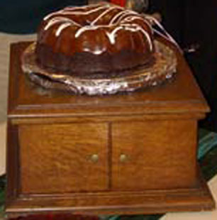 A Victor-Victrola VV-VI was used as the birthday cake stand. A pecan pie (although apple pie was Edison's favorite) provided additional representation for disc records even though the party honors the invention of Edison's 1877 tin-foil cylinder playing phonograph (the chocolate cake does, however, have tin-foil underneath it).