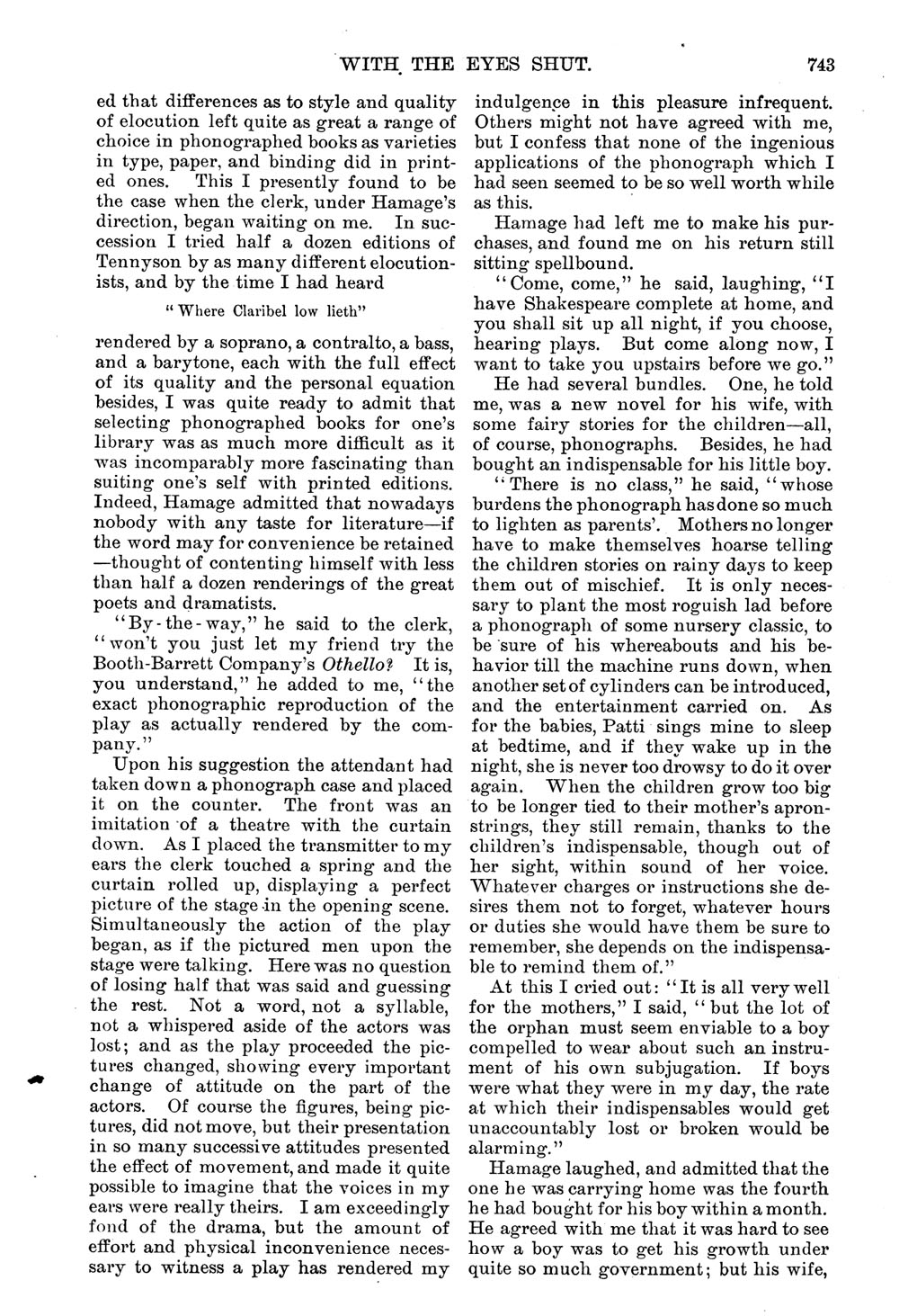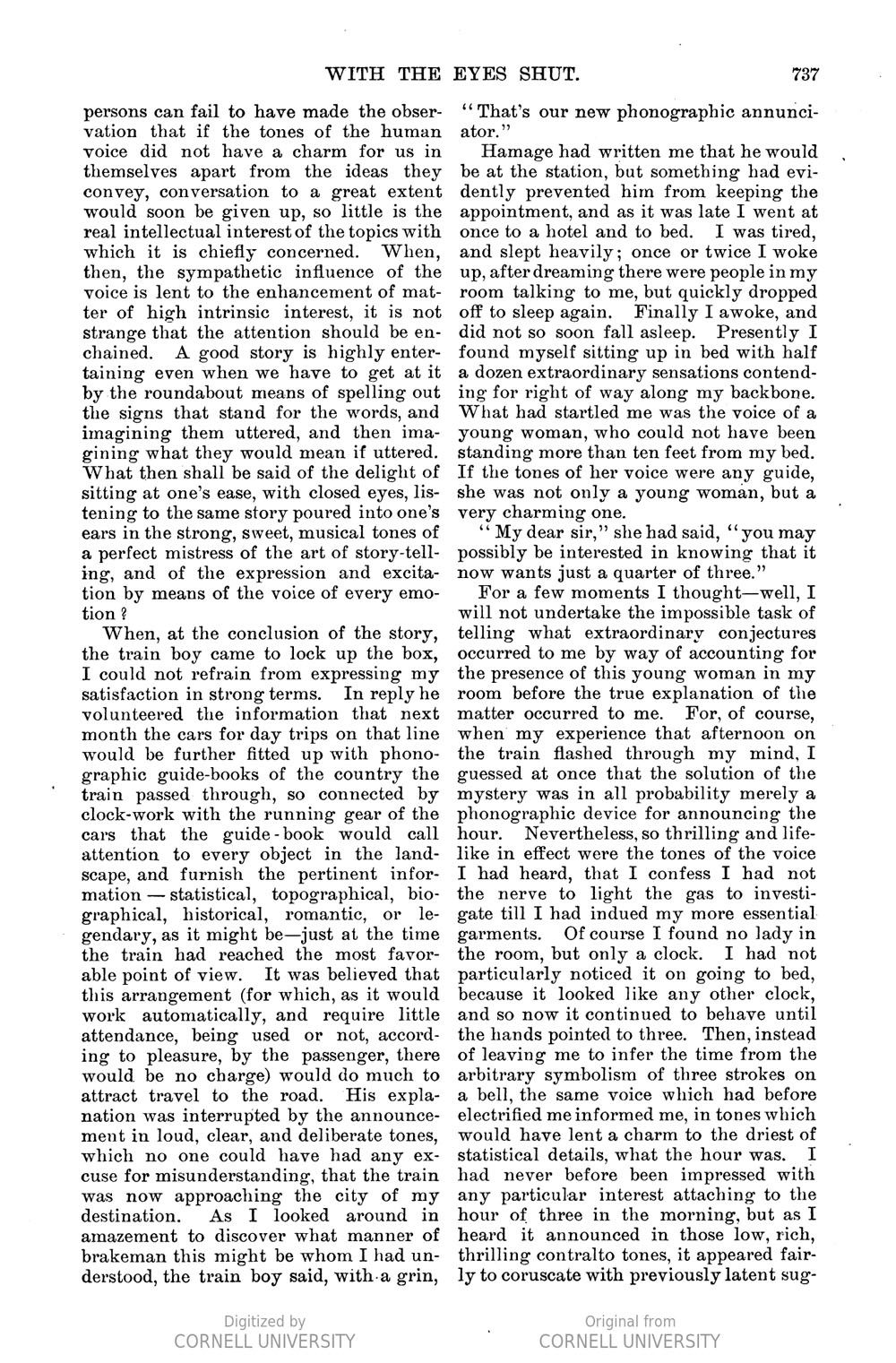 This short story by Edward Bellamy features a train ride where a passenger (the author) is asked if he wants a book to read. He replies that he can't read on the cars and only wants to be left alone. The train boy then apologizes and says: "Beg pardon, sir...but I'll give you a book you can read with your eyes shut. Guess you haven't taken this line lately," he added as I looked up offended at what seemed impertinence. "We've been furnishing the new fashioned phonograph books and magazines on this train for six months now, and passengers have got so won't have anything else." (p. 736)