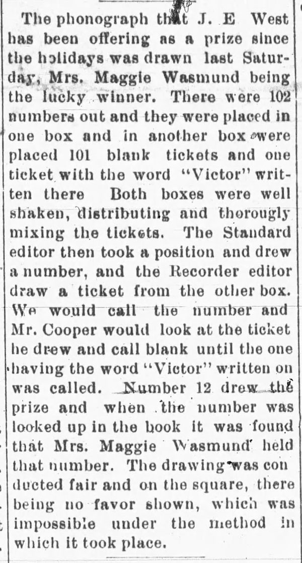 Most of the early articles appearing in local newspapers about the phonograph originated from newspapers in larger cities. In the 1880's articles often described how the phonograph was being improved and what it would soon do, often with humor. Long before many would hear a phonograph they would read about how it was being used around the USA and the world. When the phonograph became a consumer product in the 1890's the phonograph ads began appearing in newspapers and national magazines.