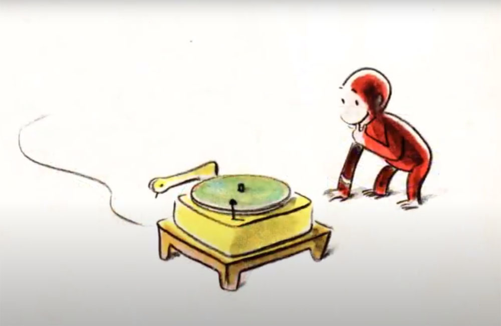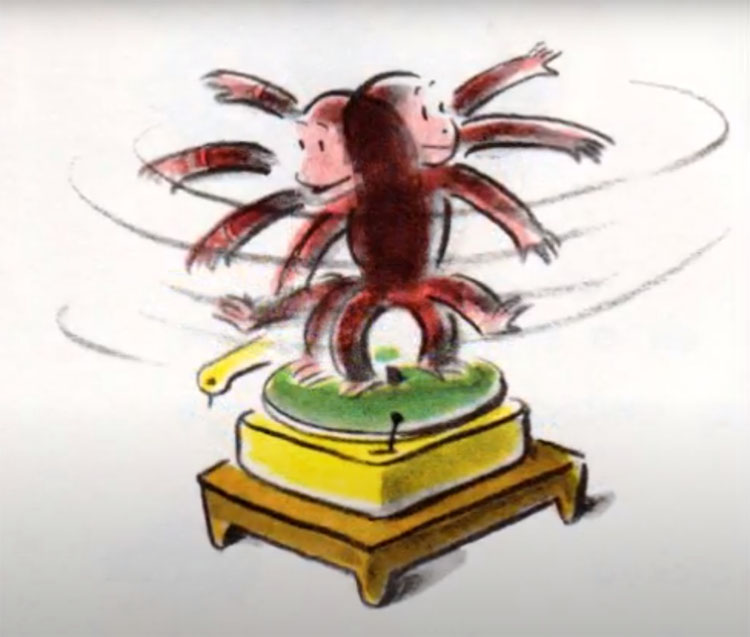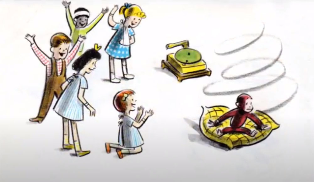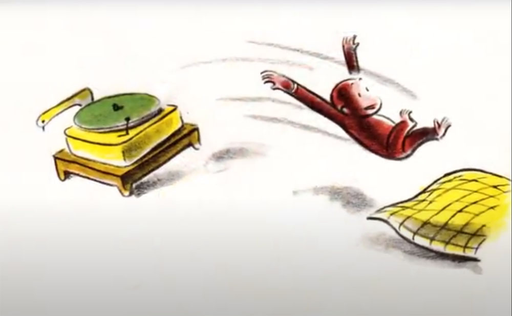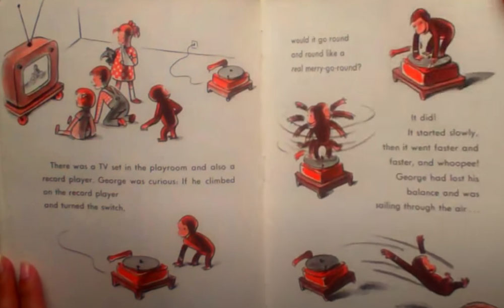 Curious George's trip to hospital includes his curiousity about a record player and his merry-go-round ride on it, luckily ending in a safe landing.
