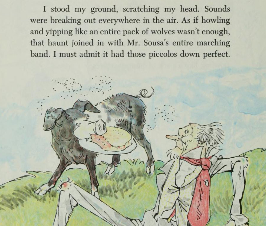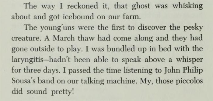 The following year an even more uncommon cold winter came. It was a "dreadful cold winter" and in the Winter of the Big Freeze "some downright unusual things" happened. "Red barns for miles around turned blue with the cold." "One day the temperature fell so low that sunlight froze on the ground." Through it all the family listened to their talking machine and John Philip Sousa's band. "My, those piccolos did sound pretty!" But when the ghosts came back, to Mr. McGroom's great displeasure, they were even able to fool him into thinking he was hearing the piccolos from his talking machine. "Confound that haunt!" McGroom exploded. "Now it's imitating John Philip Sousa's entire marching band!"