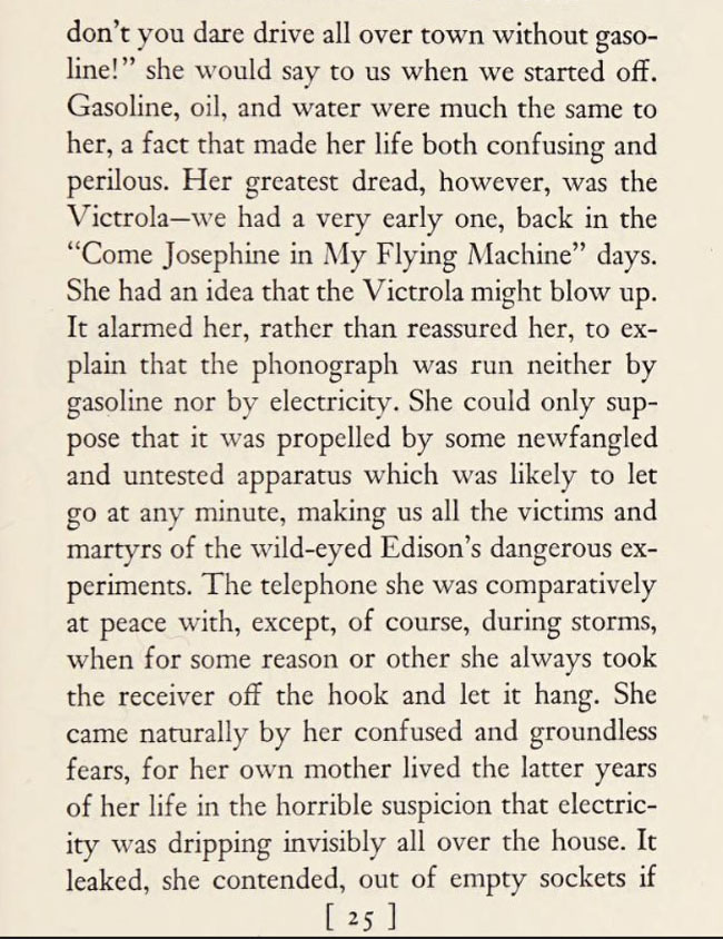 In his chapter "The Car We Had to Push" Thurber tells about his mother's greatest fear in life: "the Victrola."