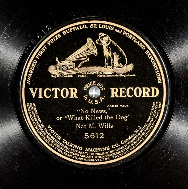 Listen to "No News," or "What Killed the Dog" by Nat M. Wills, Victor 5612, Recorded October 14, 1908 (Courtesy David Giovannoni Collection, i78s.org)