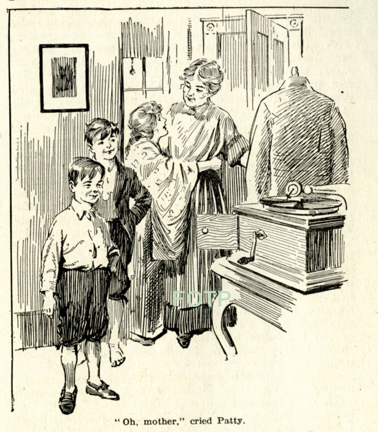 The story begins with a description of the modest cottage belonging to Mrs. Valentine, a widower, and her three children, Patty, Ben and Sandy where Mrs. Valentine also runs her "Dress-maker" business. The brothers have often talked about purchasing a Victrola but at this point it hasn't been discussed with their mother. The idea of buying a Victrola was for Patty just like when she was a little girl and she pretended that she was a princess, and their small cottage was a beautiful palace. In other words, Patty was against it because it cost twenty-five dollars and she knows her mother won't go into debt for anything and that it's a struggle for her mom just to cloth and feed all of them.