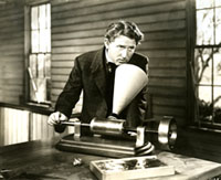 Tin-foil phonograph - Spencer Tracy as Edison inventing the phonograph at Menlo Park Lab. See Movie Still, movie poster and WATCH Movie Clip (Courtesy The Victrolaguy).