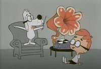 Gramophone open horn - Daffy Duck, Foggy Leghorn and the dog - Daffy is a salesman for the Ace Novelty Co. and supplies tricks and practical jokes to Leghorn and the dog in their running battle of bombs and revenge. One of the things Daffy supplies Leghorn with is a gramophone with a sound effects record which he plays, setting the machine next to the dog's doghouse. It is the sound of a train and Leghorn puts a cutout train in front of the dog and pretends that he is an approaching train, ready to smash into the doghouse. Nice image of the machine and a close-up of the record (Ace Novelty Co. Sound Effects).
