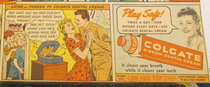Husband has been ignoring his wife because of bad breath. Dentist recommends Colgate. Colgate newspaper ad, 1943