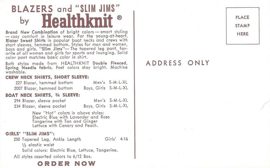 Healthknit® postcard for ordering blazers and "Slim Jims" c.1965
