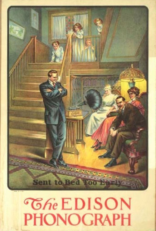 to Bed Too Early" lithograph, Edison ad c. 1908